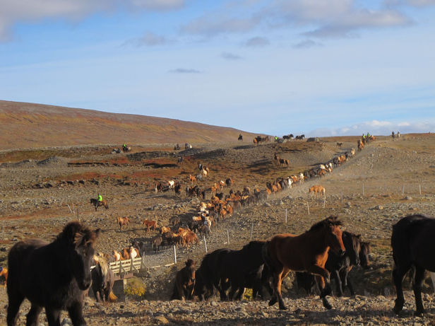 We join them and help driving the herd down to the Víðidalstungurétt corral. When this task has been fulfilled